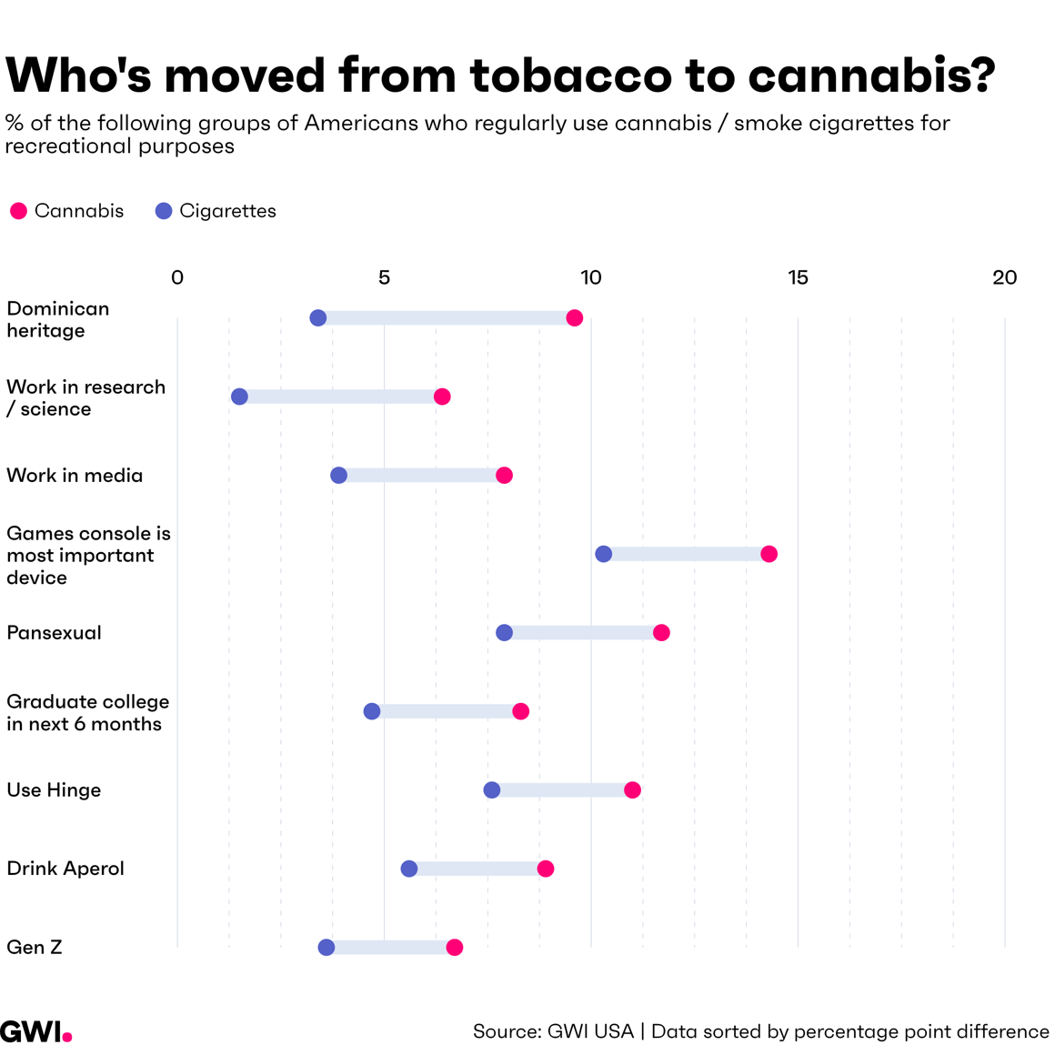 For decades cigarettes were shorthand for stress reduction, rebellion, and social cachet. But as cannabis legalization has spread across the USA, it’s become the preferred regular habit for some. Here, we’ve identified some of the key audiences where cannabis use has overtaken cigarettes the fastest.