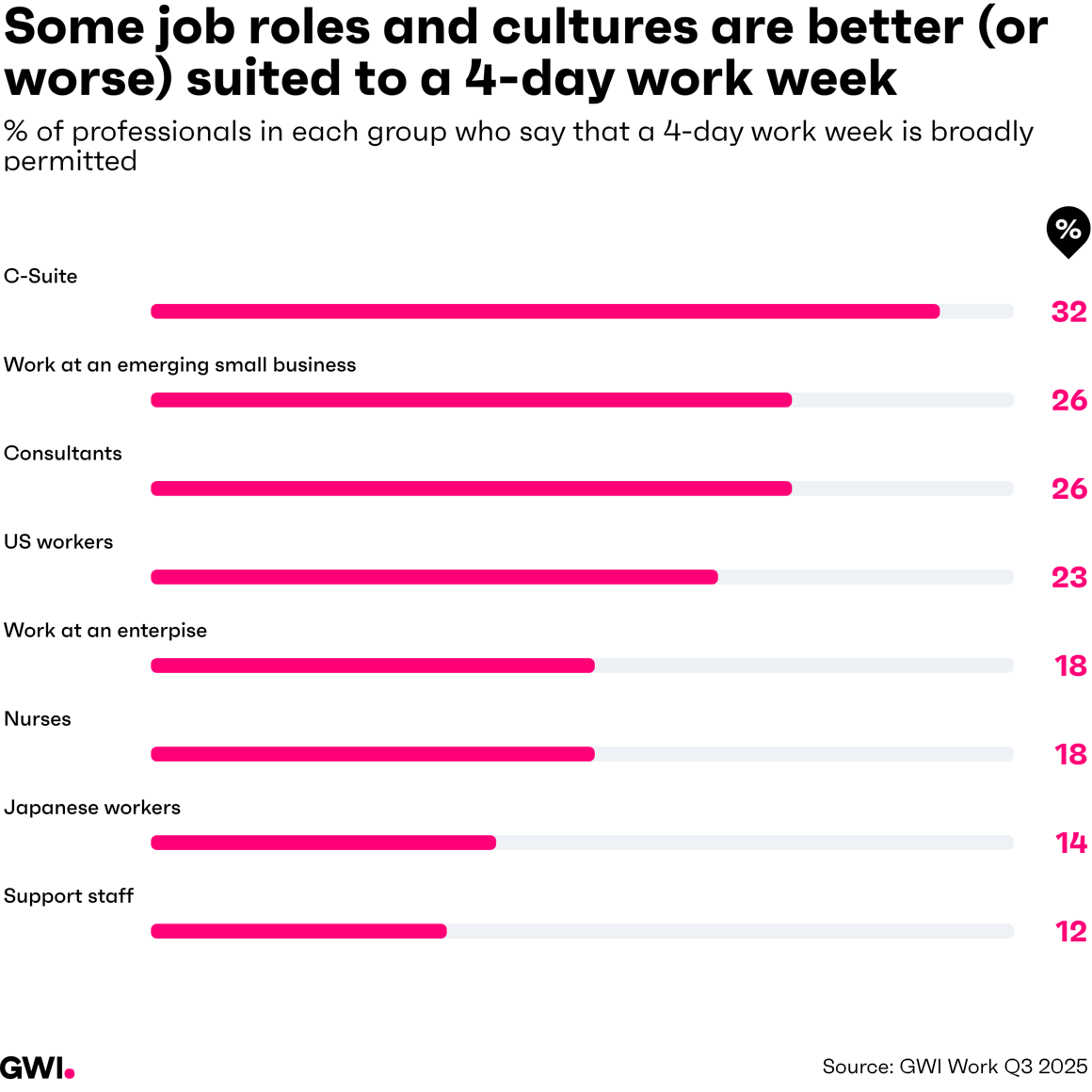1 in 5 now say a 4 day week is on the cards at their company. Employees in companies that broadly allow it are 54% more likely to be extremely satisfied with their job and 26% more likely to rate their company as excellent for productivity.