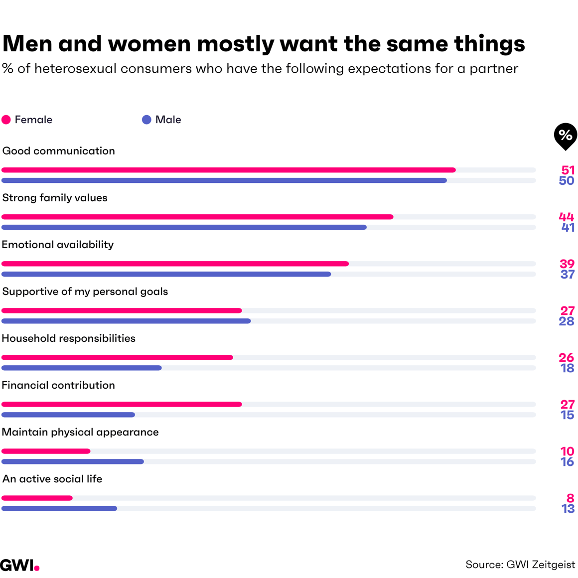 For all the gender polarization online, men and women are pretty aligned in their expectations for a relationship. Communication, family values, emotional availability, and mutual support are at the top for both, with the genders scoring roughly equal for each.