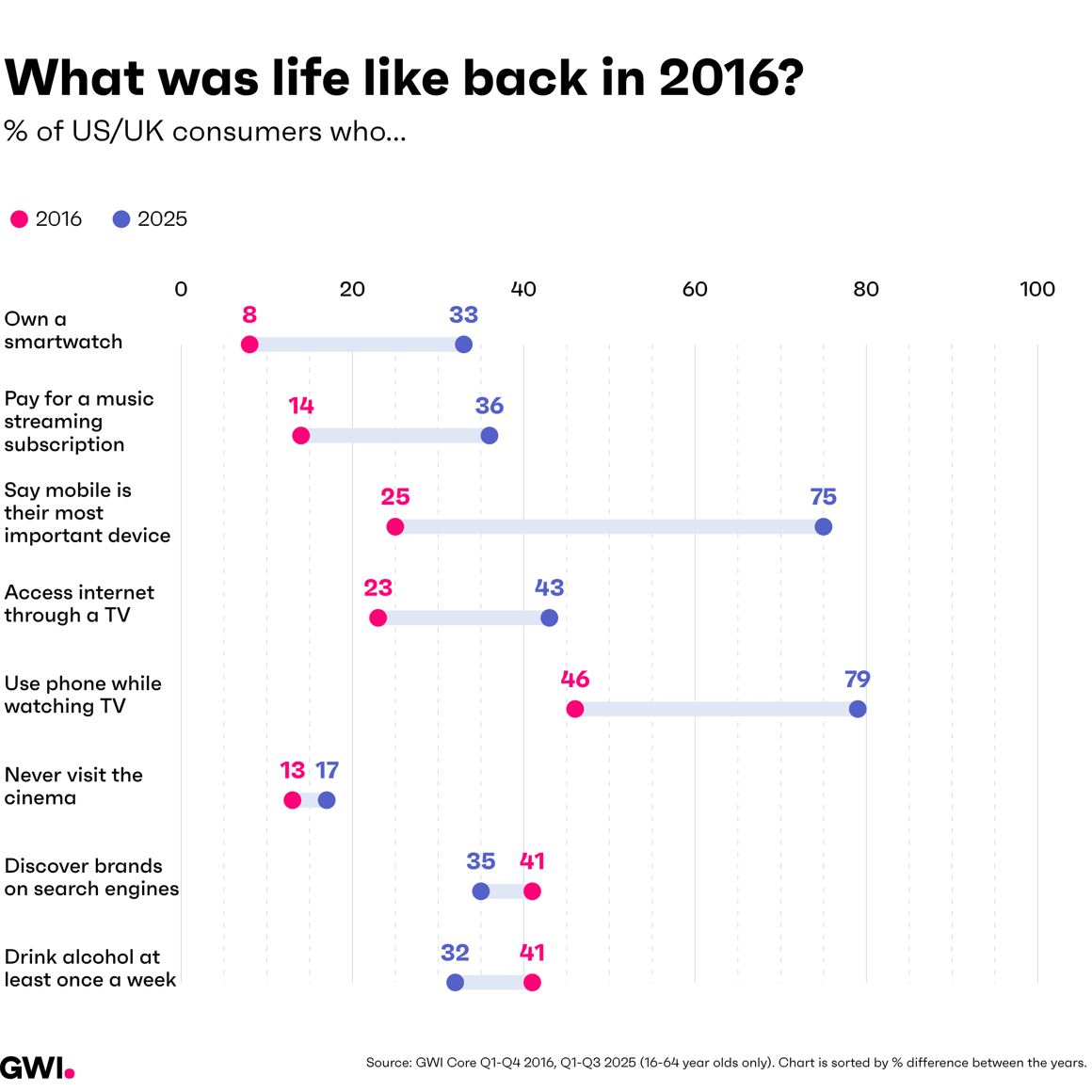 Zooming out shows you just how much we’ve become absorbed in digital life, and how we’ve gone from PC-first to smartphone-first - with second-screening now almost universal. Smartwatches and smart TVs have also joined the mass market, while the last decade has been less kind to the cinema, search ads, and the alcohol industry.