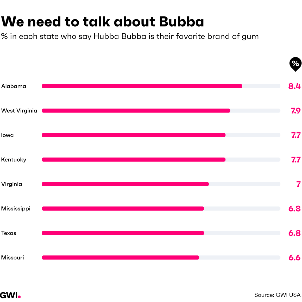 Well, here’s the thing. If you look at Google Trends data, Alabama is the most “Bubba” state - it searches for that name the most. But the wild thing is, in GWI USA data, Alabama is top for saying Hubba Bubba gum is their favorite brand. Coincidence? Surely not.